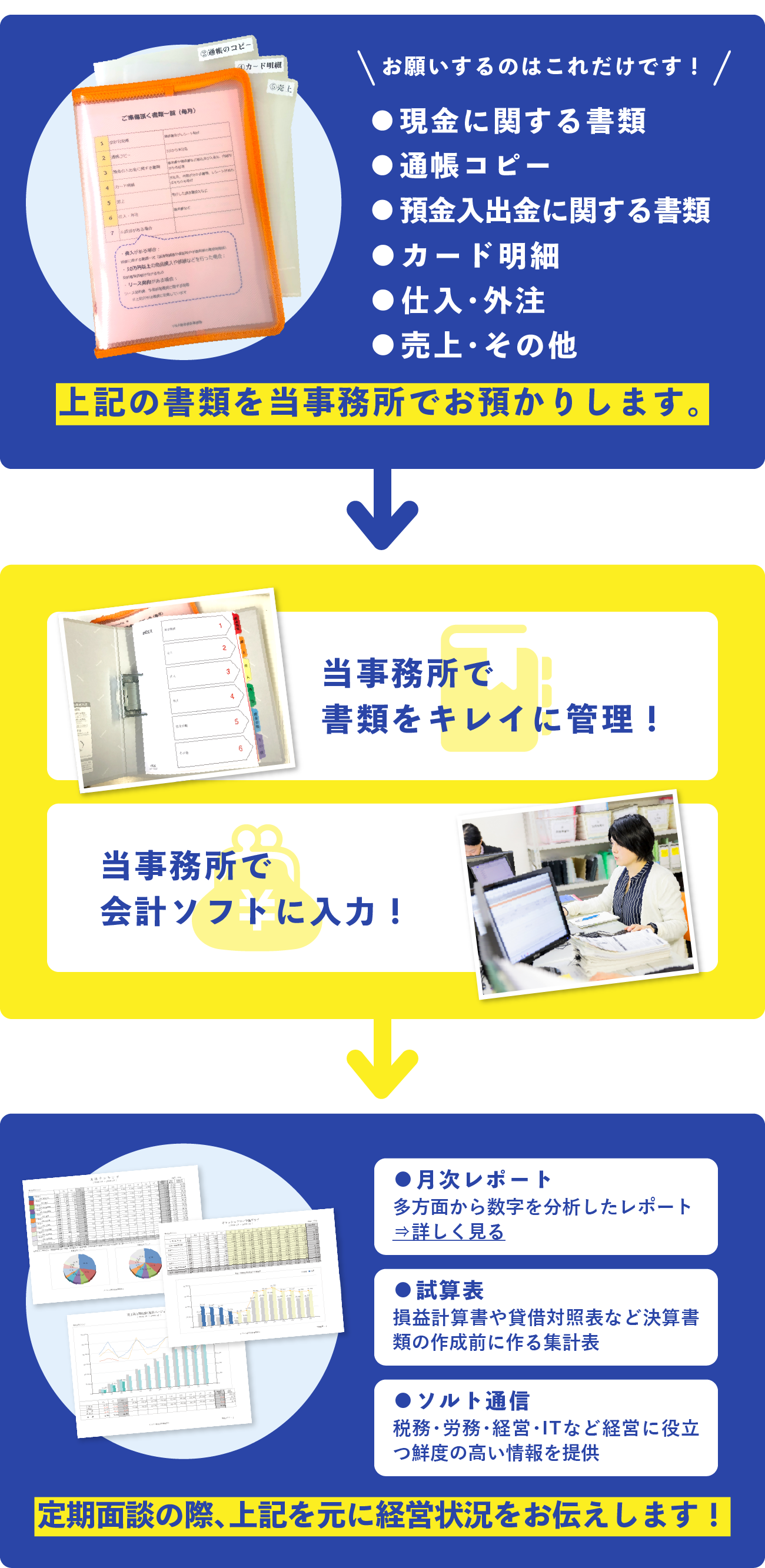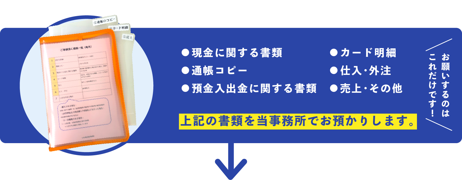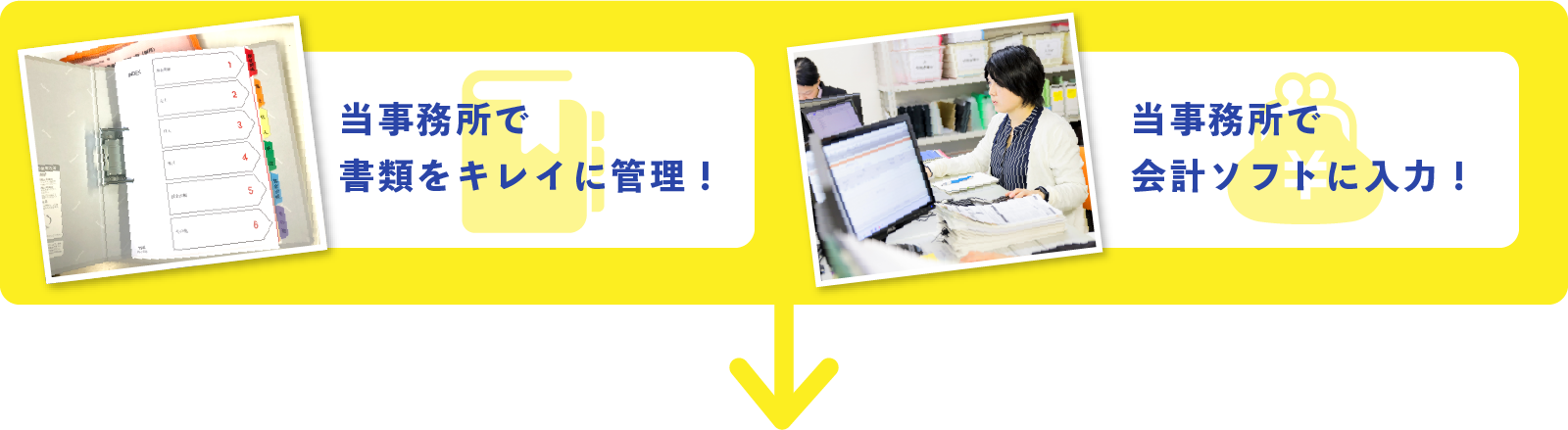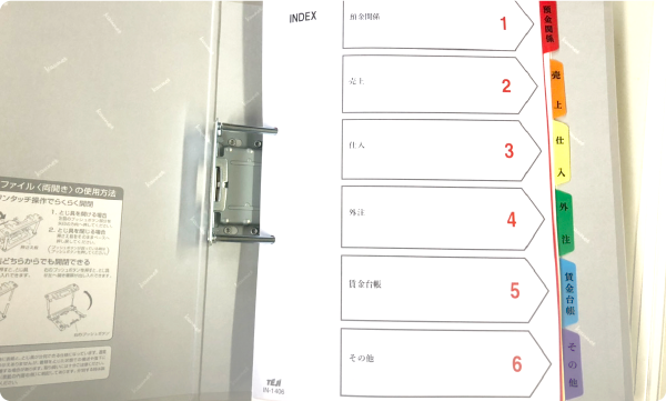 お預かりした請求書、領収書、通帳のコピー、売上請求書、給与台帳等の証憑書類について、キレイに整理し、事業年度毎にお返しします。